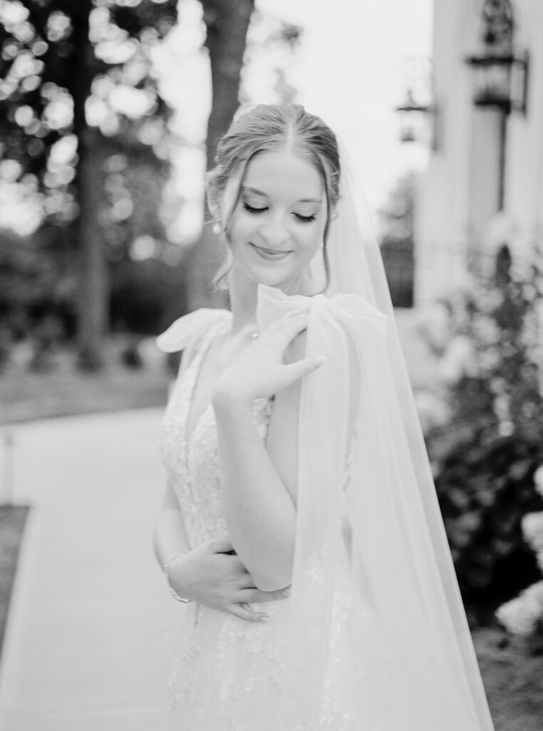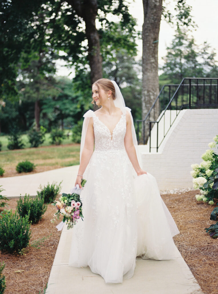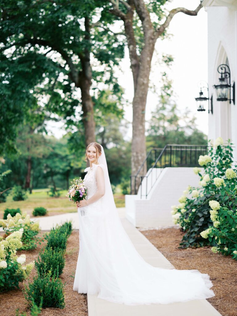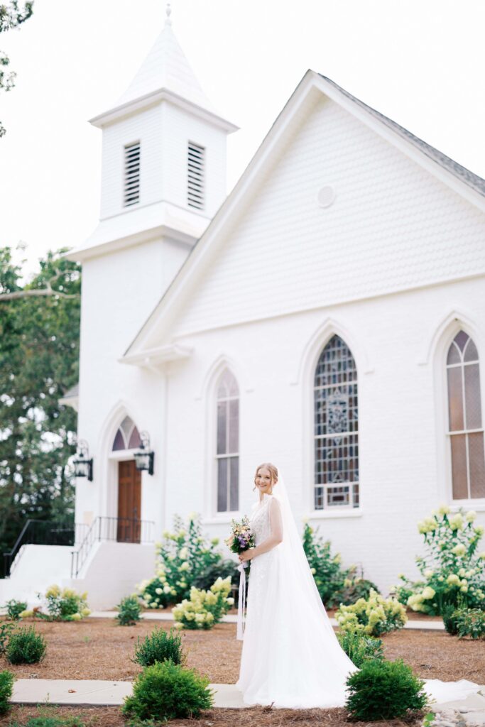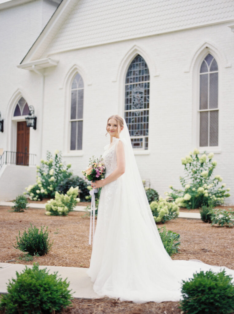 Elizabeth’s summer bridal portraits at Magnolia Hill Chapel, just outside of Winston Salem, were a dream! I’m so excited to share these because she is officially a married woman! Her stunning gown is from English’s Bridal, designed by Justin Alexander. I absolutely love her dress with those little cute bows (they can even be removed, so they don’t get in the way of dancing the night away).