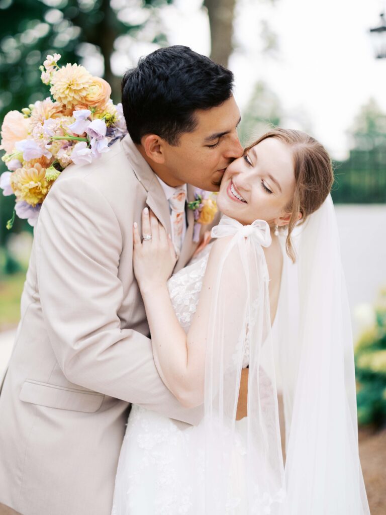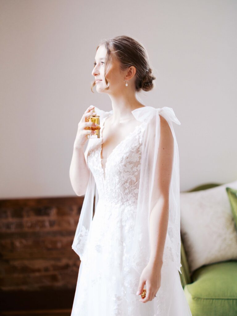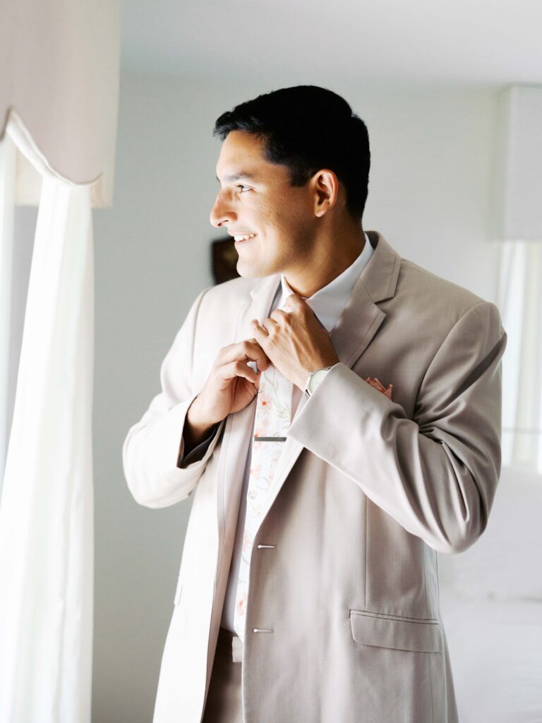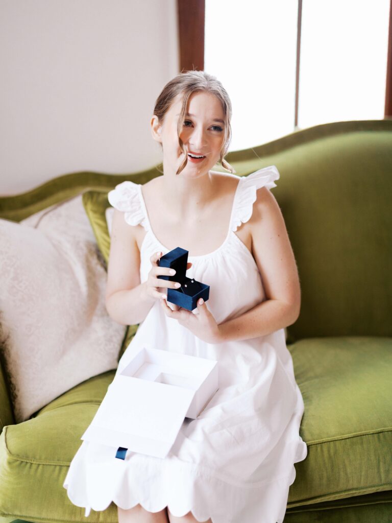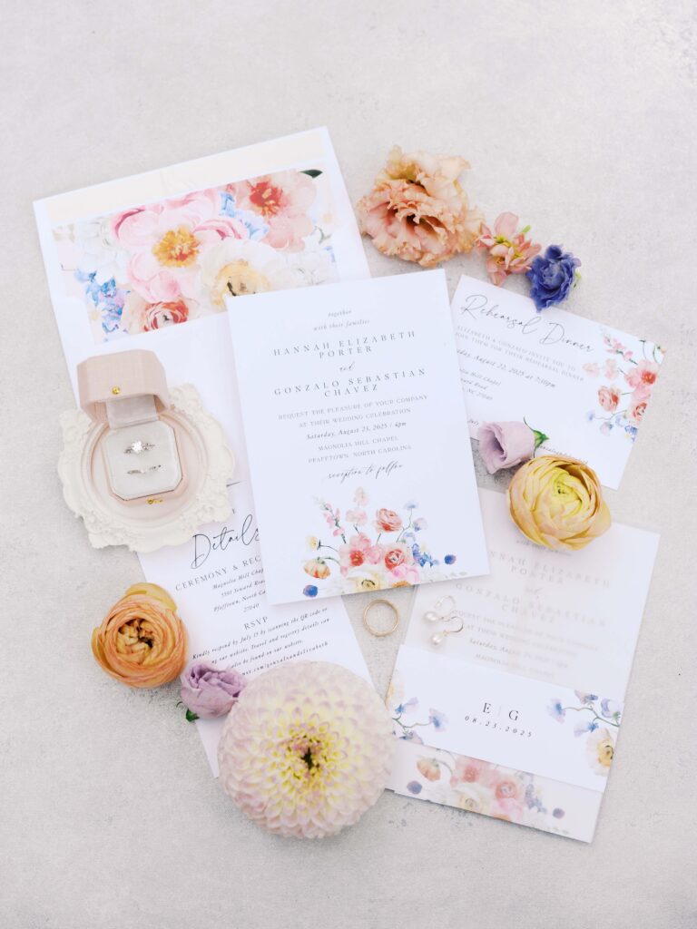 Elizabeth shared with me how excited she was about. her detail photos, and her invitation suite delivered. The soft pastel color palette was stunning for this North Carolina summer wedding. Gonzalo gifted Elizabeth a pair of diamond earrings the morning of their wedding, which she paired with earrings that had been passed down through the family.