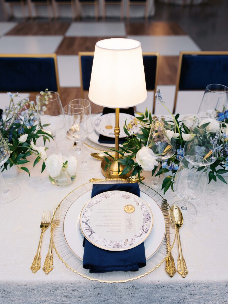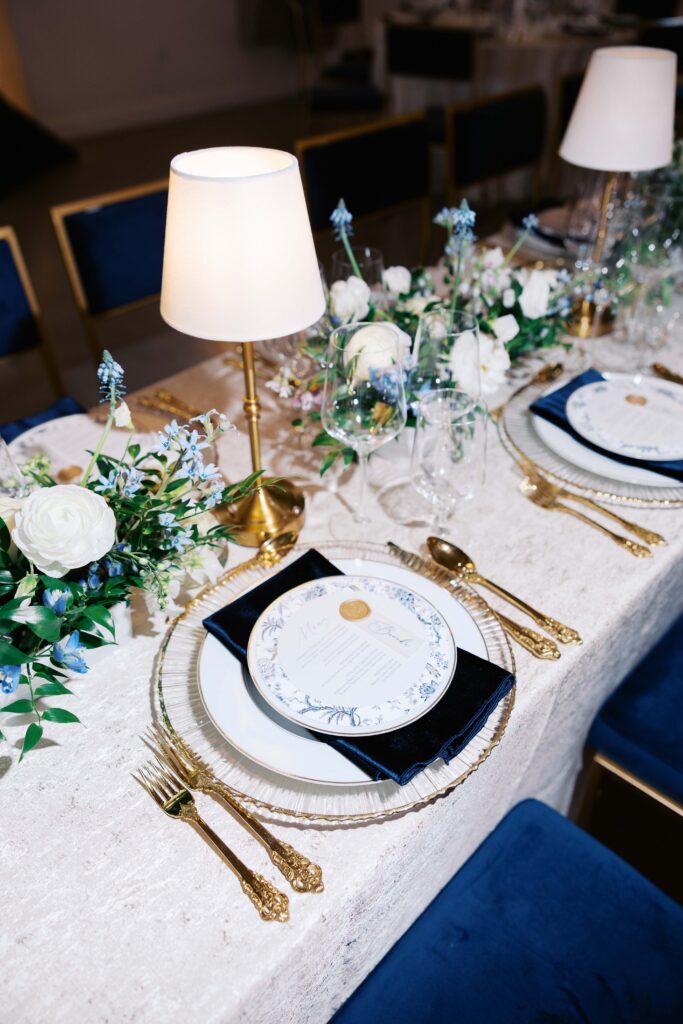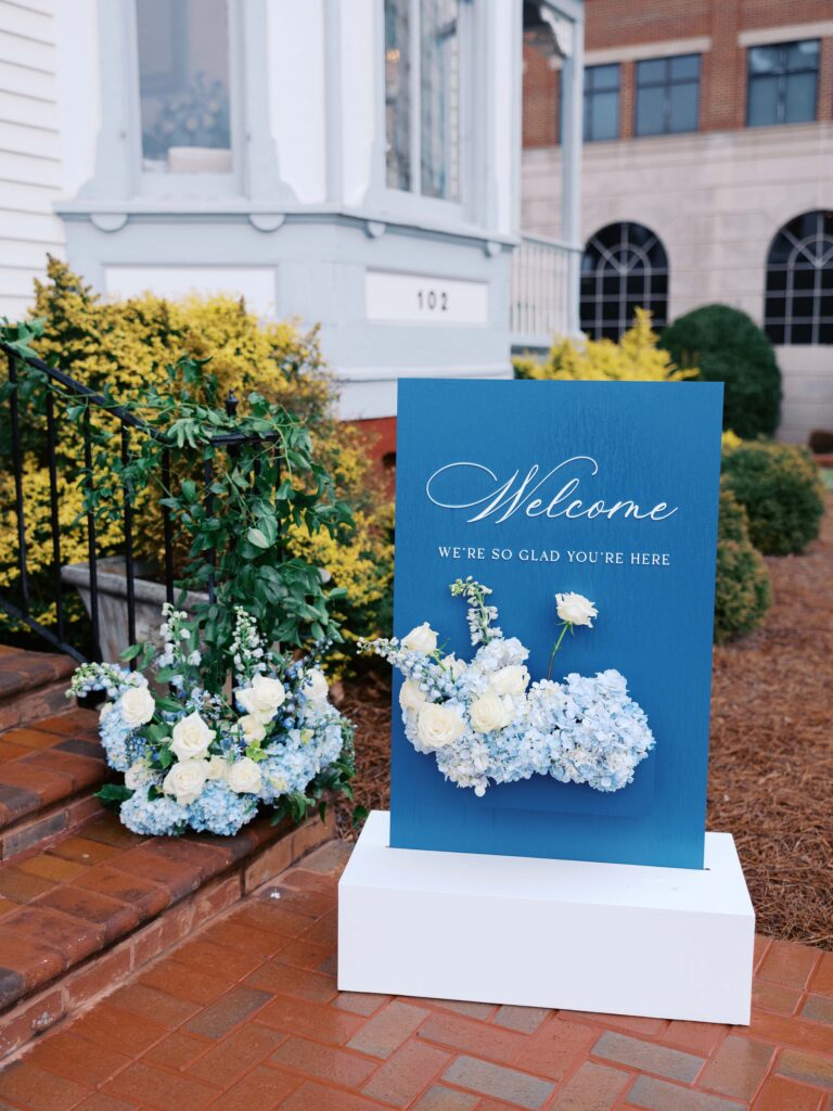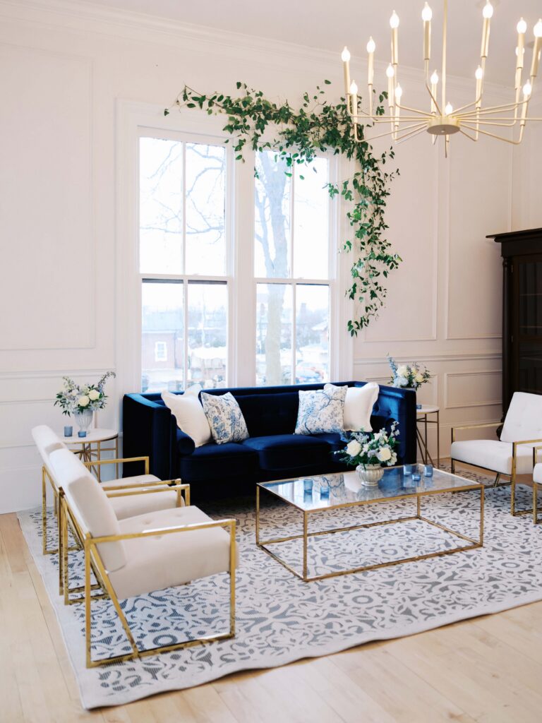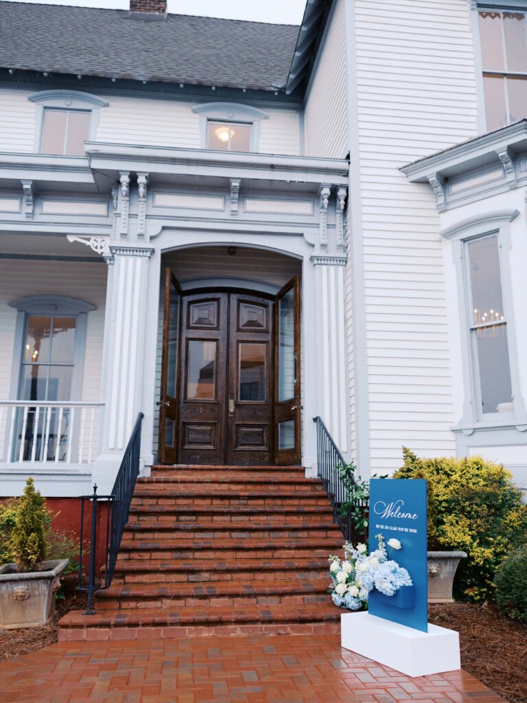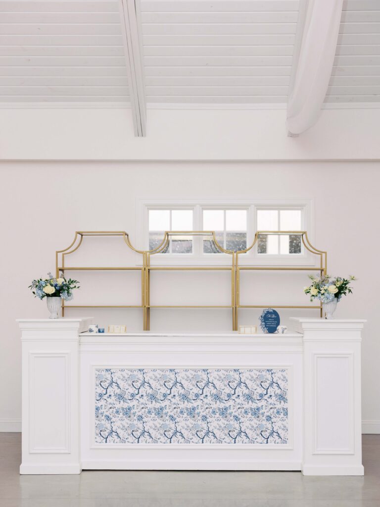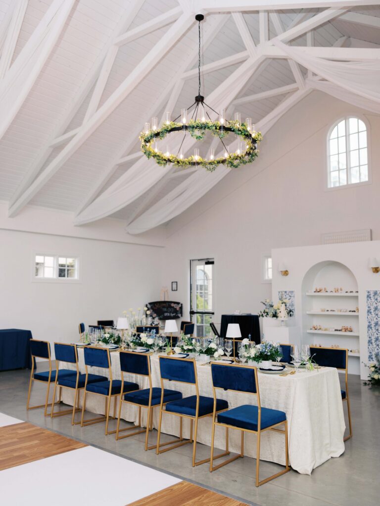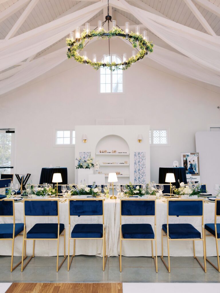 This space is charming, bright, and stunning on its own. The photos below will show you how this downtown Winston-Salem wedding venue can be designed for a beautiful blue and white wedding. This was the design for the winter Open House at The Crest in January of 2026.