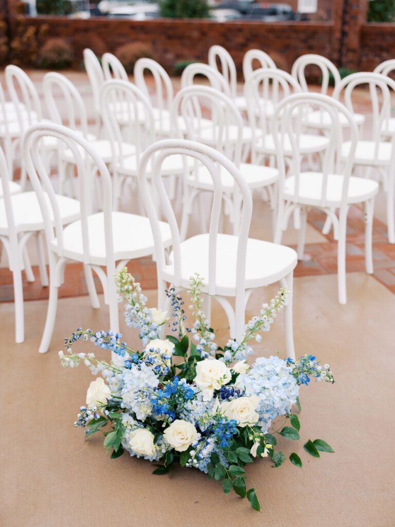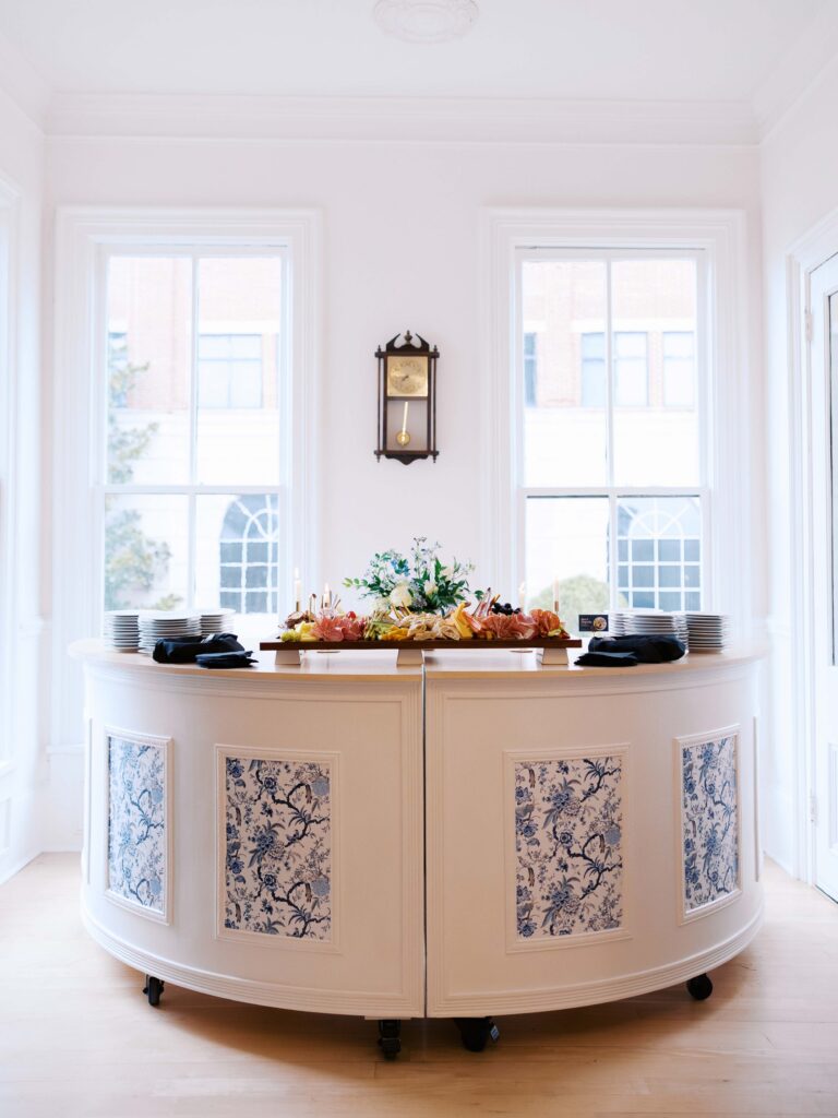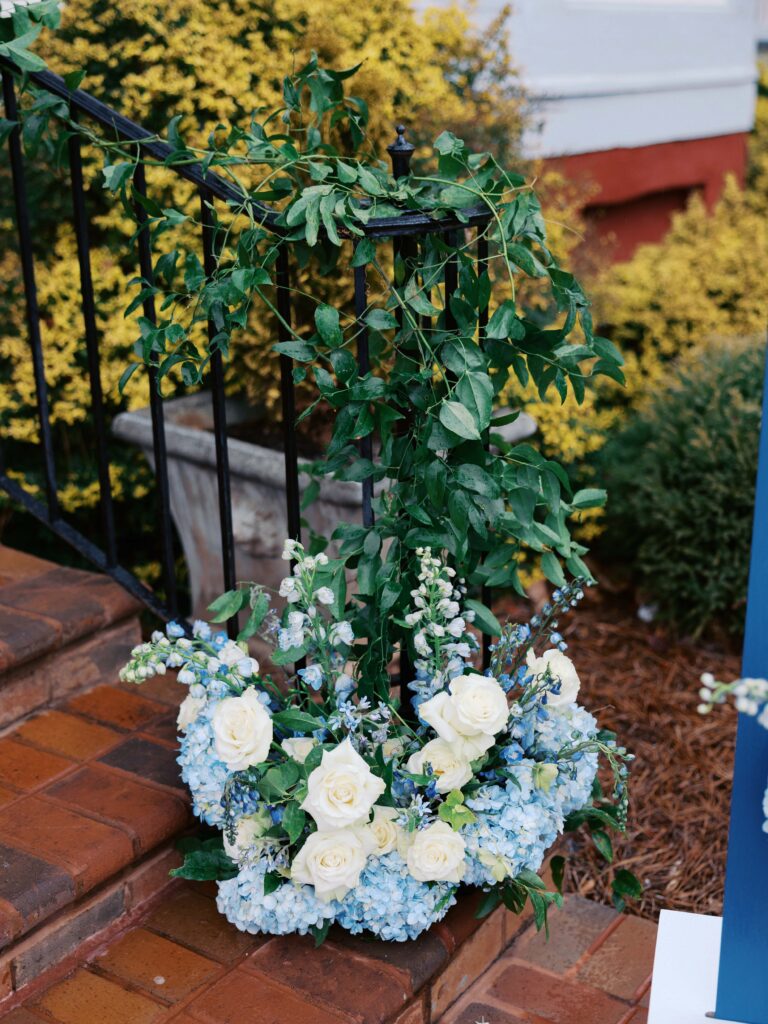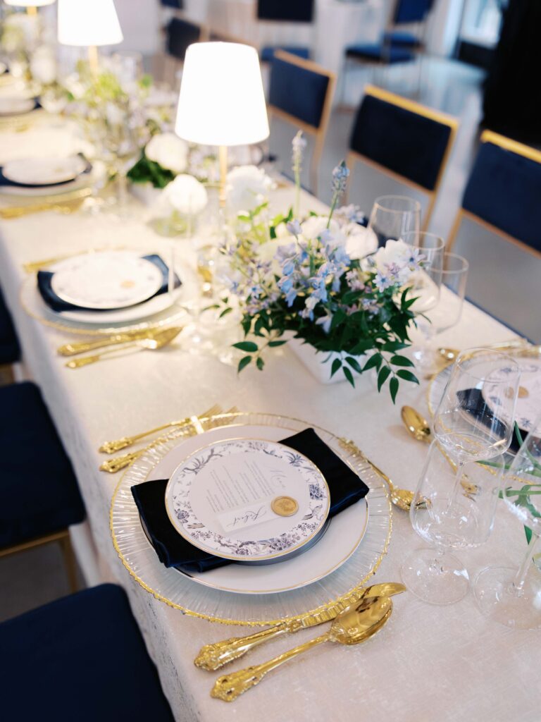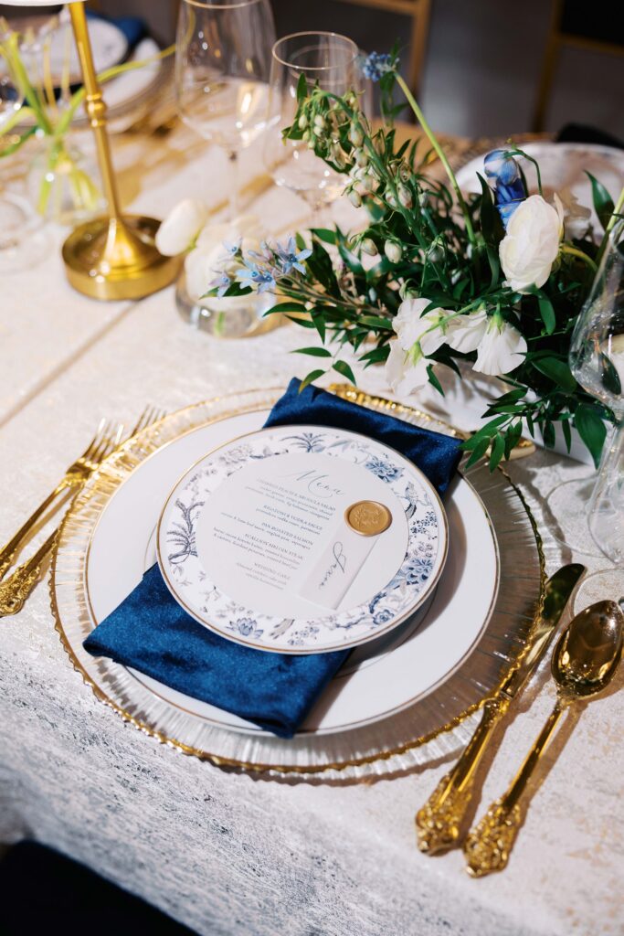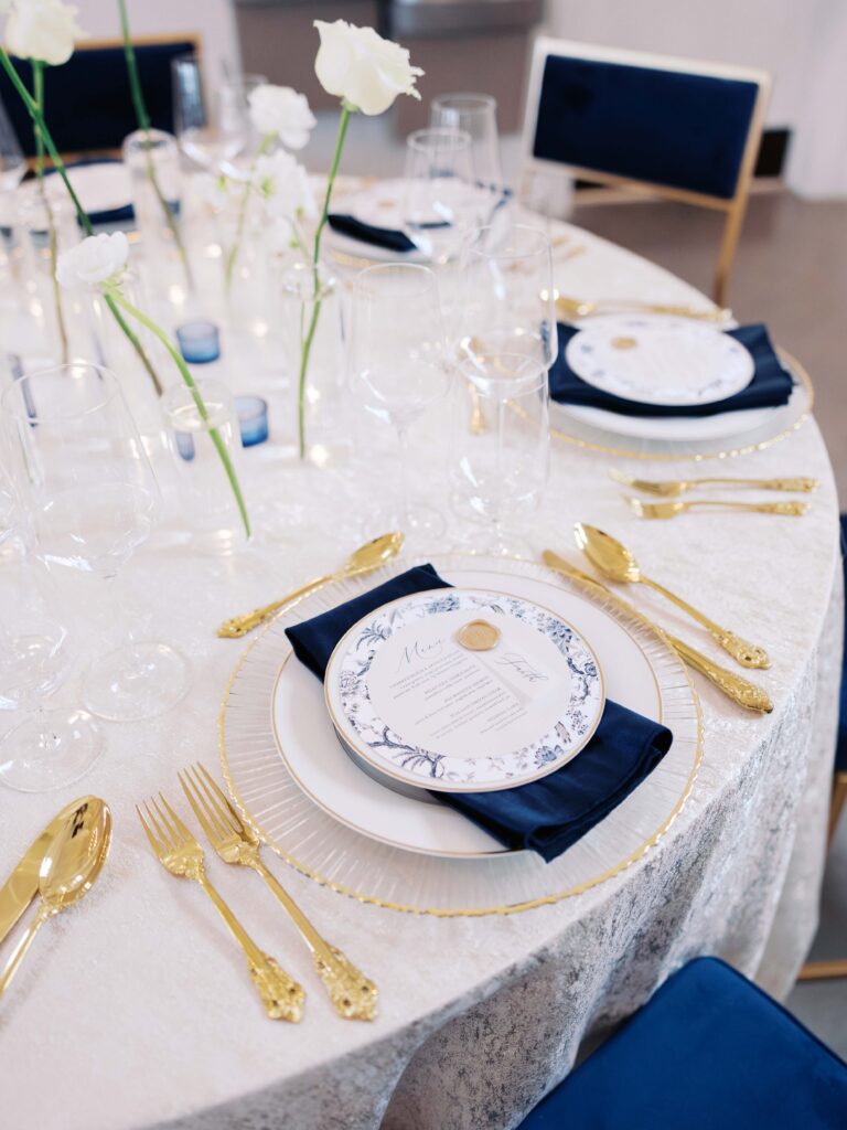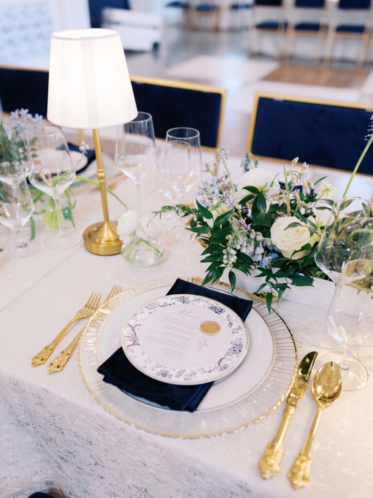 This space is charming, bright, and stunning on its own. The photos below will show you how this downtown Winston-Salem wedding venue can be designed for a beautiful blue and white wedding. This was the design for the winter Open House at The Crest in January of 2026.