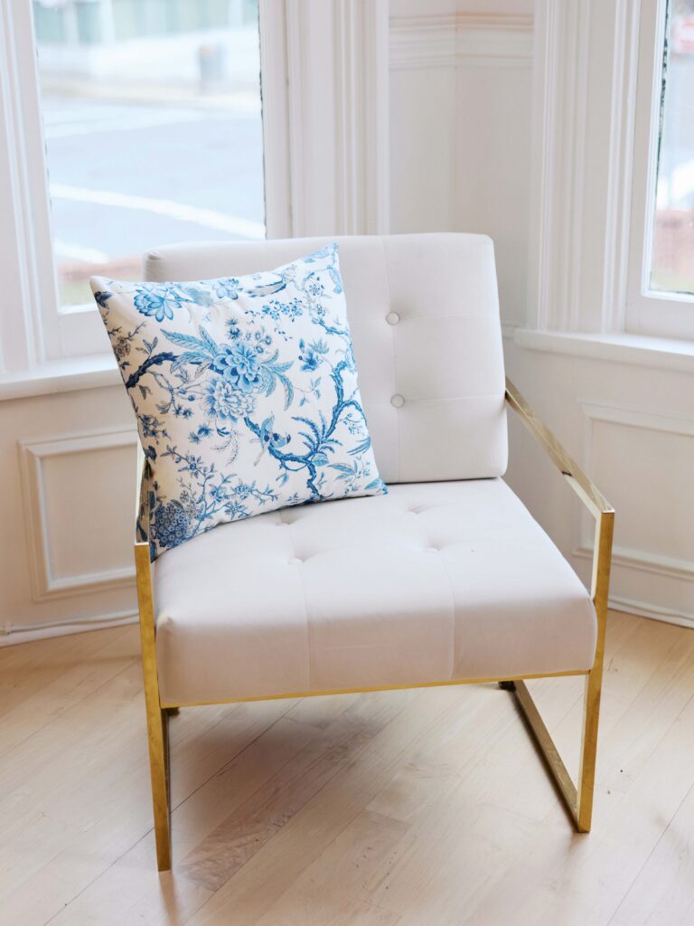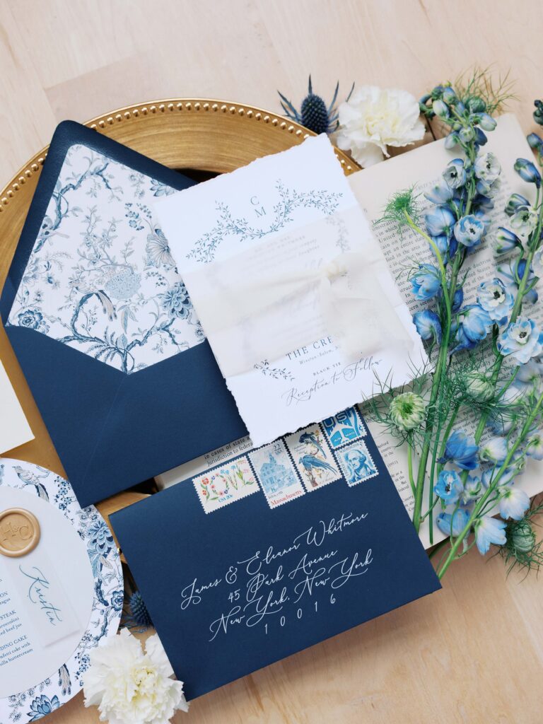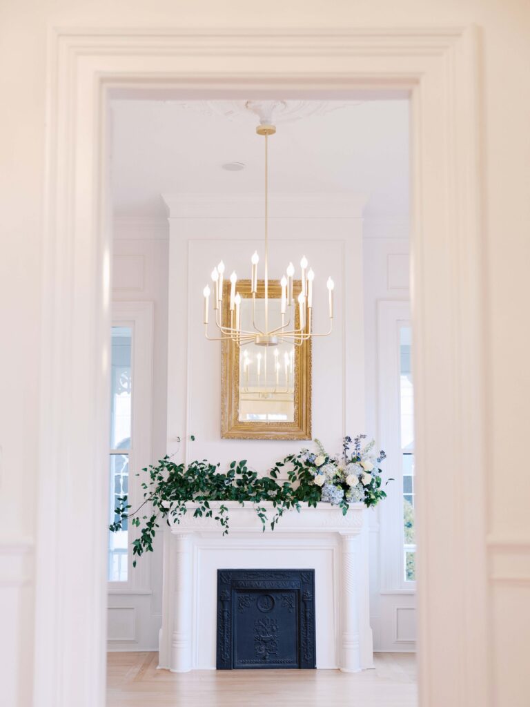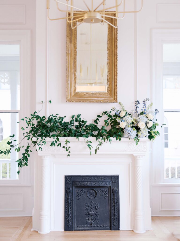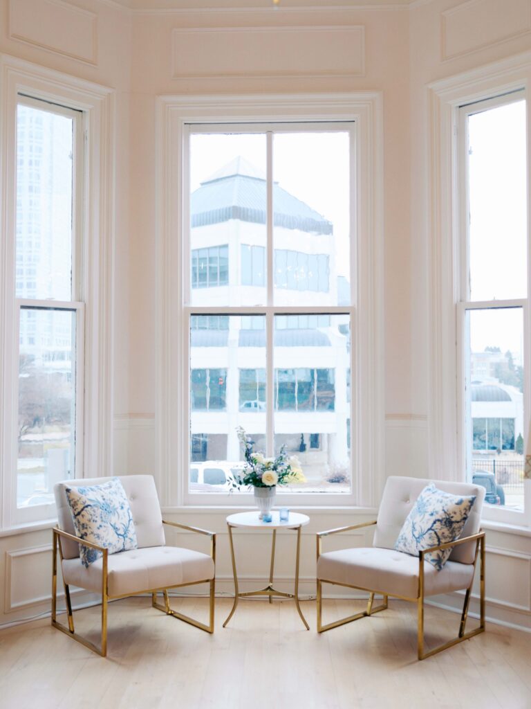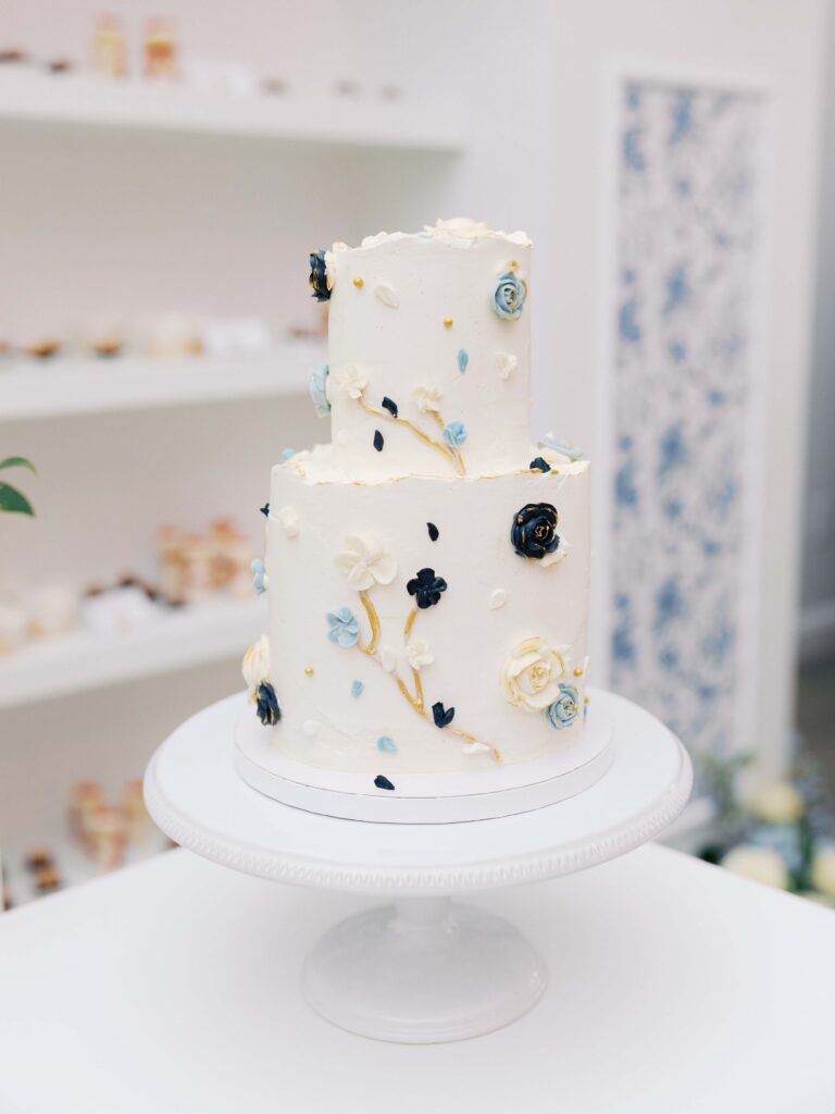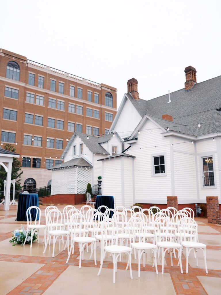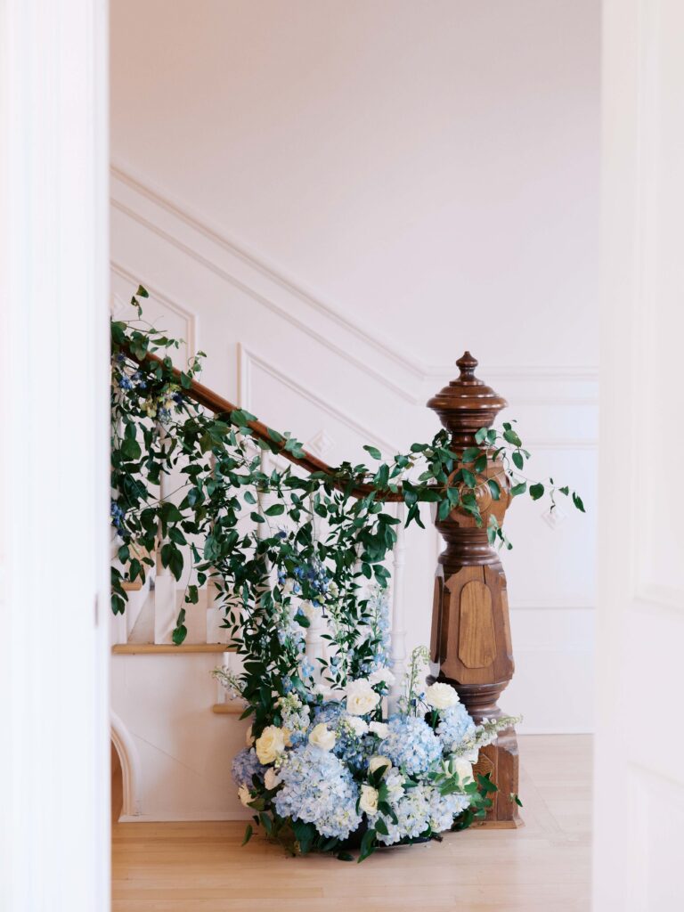 This space is charming, bright, and stunning on its own. The photos below will show you how this downtown Winston-Salem wedding venue can be designed for a beautiful blue and white wedding. This was the design for the winter Open House at The Crest in January of 2026.